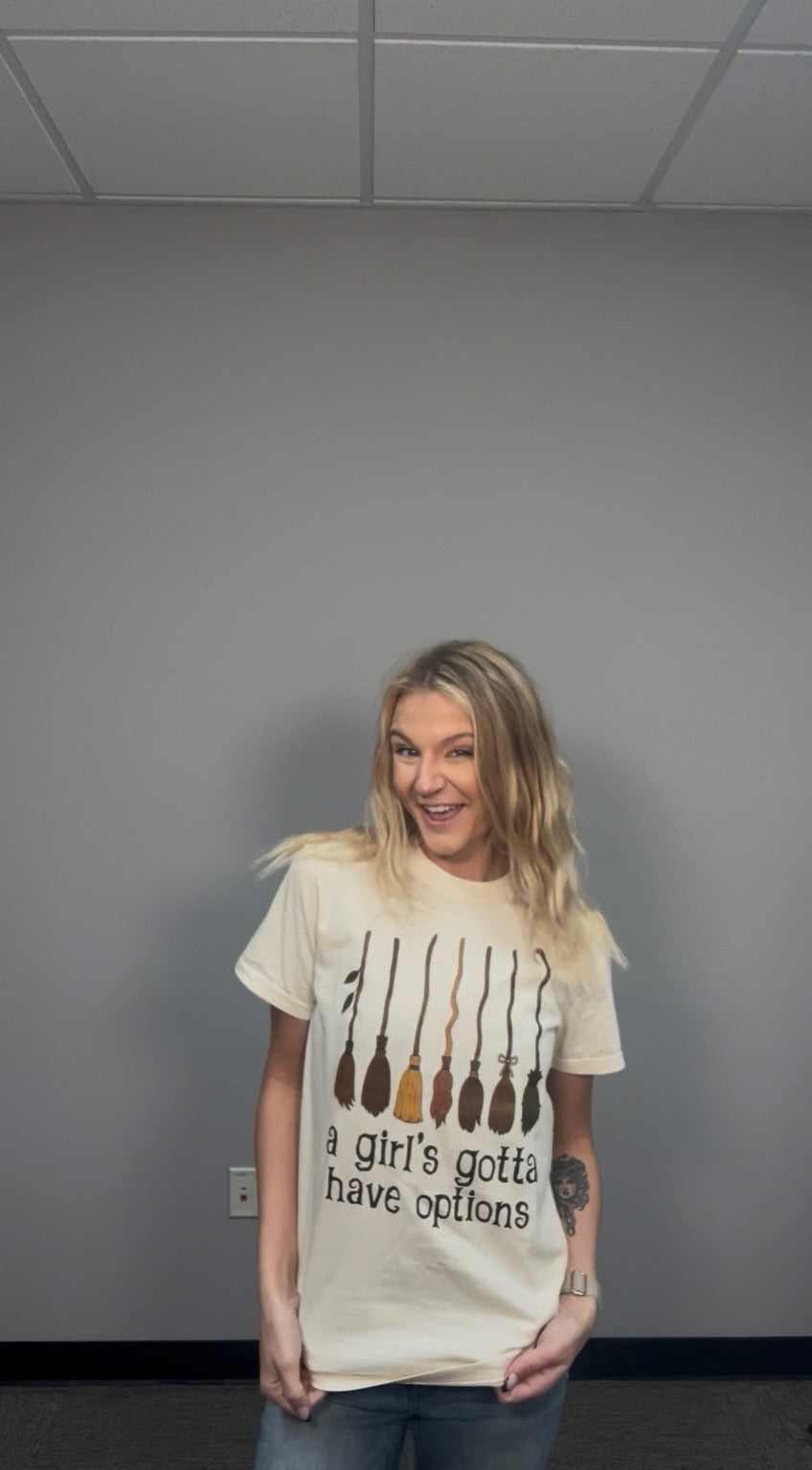 Embrace a playful vibe with the Girl's Gotta Have Options tee, featuring a fun broom graphic that adds a whimsical touch to any outfit. Perfect for those who love mixing style with a dash of personality, this tee offers comfort and charm for everyday adventures.