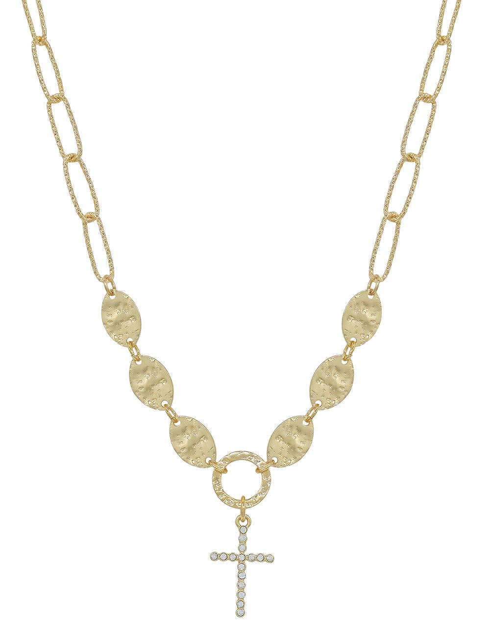 Add a touch of charm with the Gold Chain featuring Hammered Circles and a Rhinestone Cross, adjustable from 16" to 18". This necklace from What's Hot mixes subtle sparkle with cool simplicity, perfectly capturing your fun-loving style. More than just jewelry, it's a playful way to show off your unique vibe while embracing the latest trends.