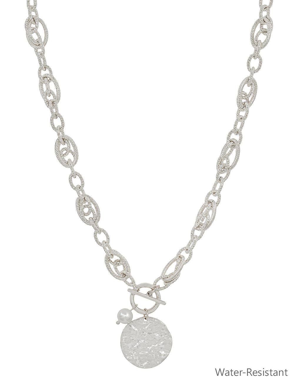 Discover the Water Resistant Silver Chain with Hammered Coin and Pearl Necklace from What's Hot! Adjustable between 16" and 18", this charming pendant adds a dash of fun elegance to any look. Inspired by current trends, it’s a stylish and affordable way to brighten your accessory game.