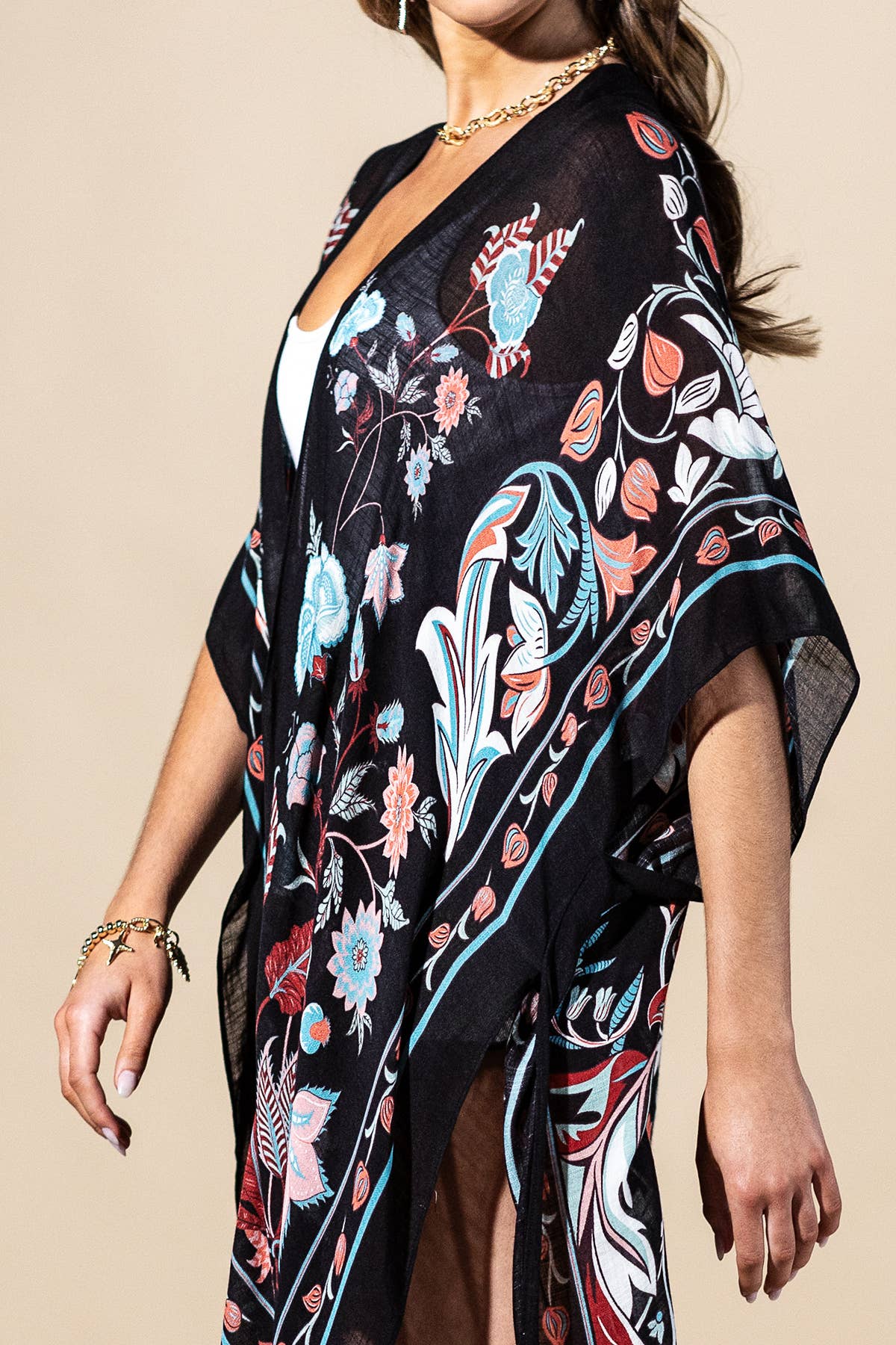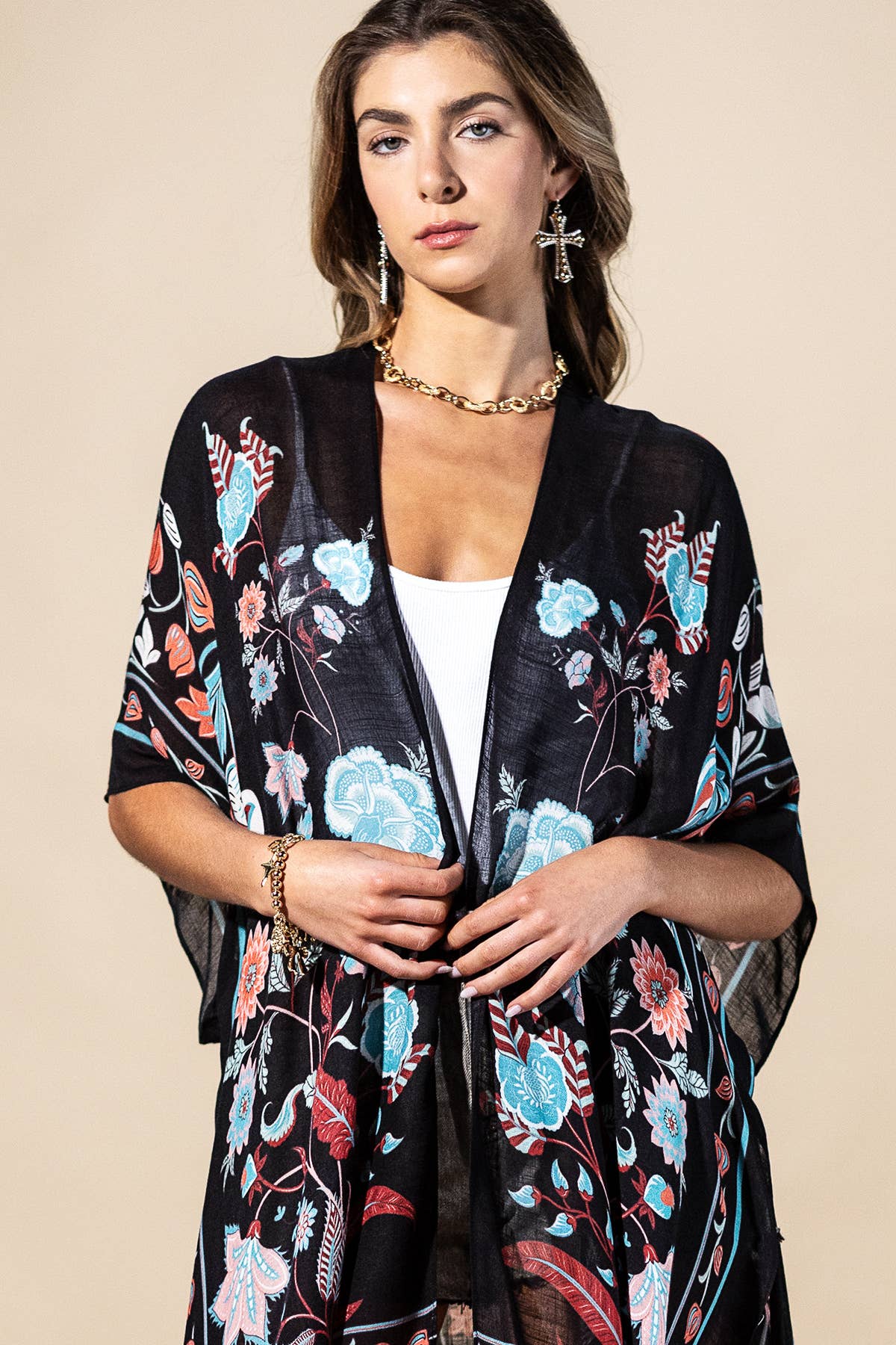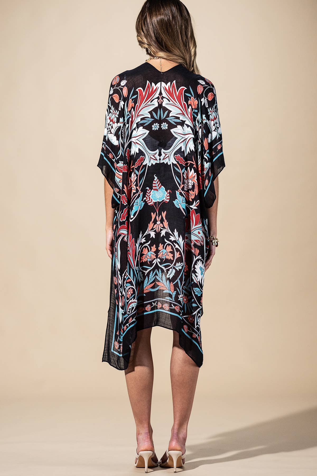 Lightweight kimono featuring an allover leaf and floral print arranged in a flowing, organic layout. Designed with an open front, wide sleeves, and a relaxed, straight drape that falls easily on the body. The semi-sheer fabric moves softly, making it an easy layering piece for everyday wear or warm-weather styling.