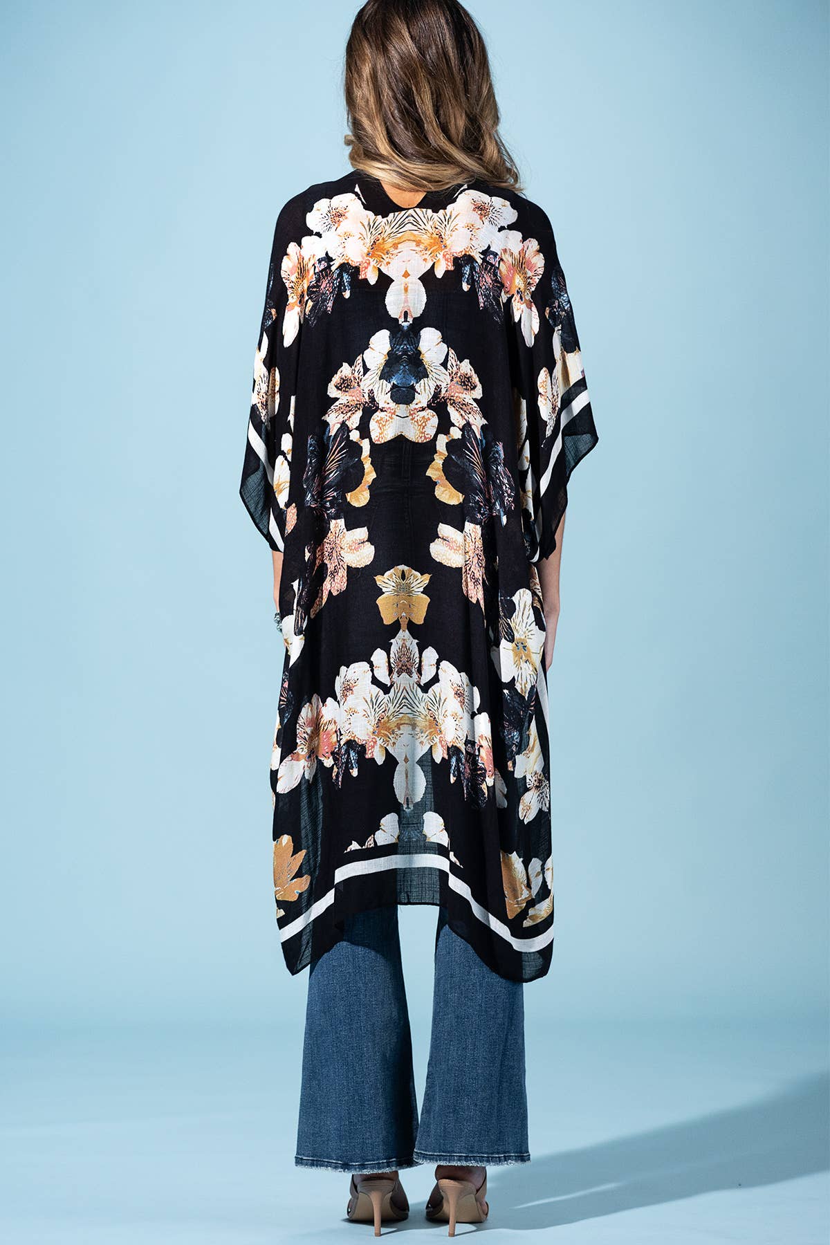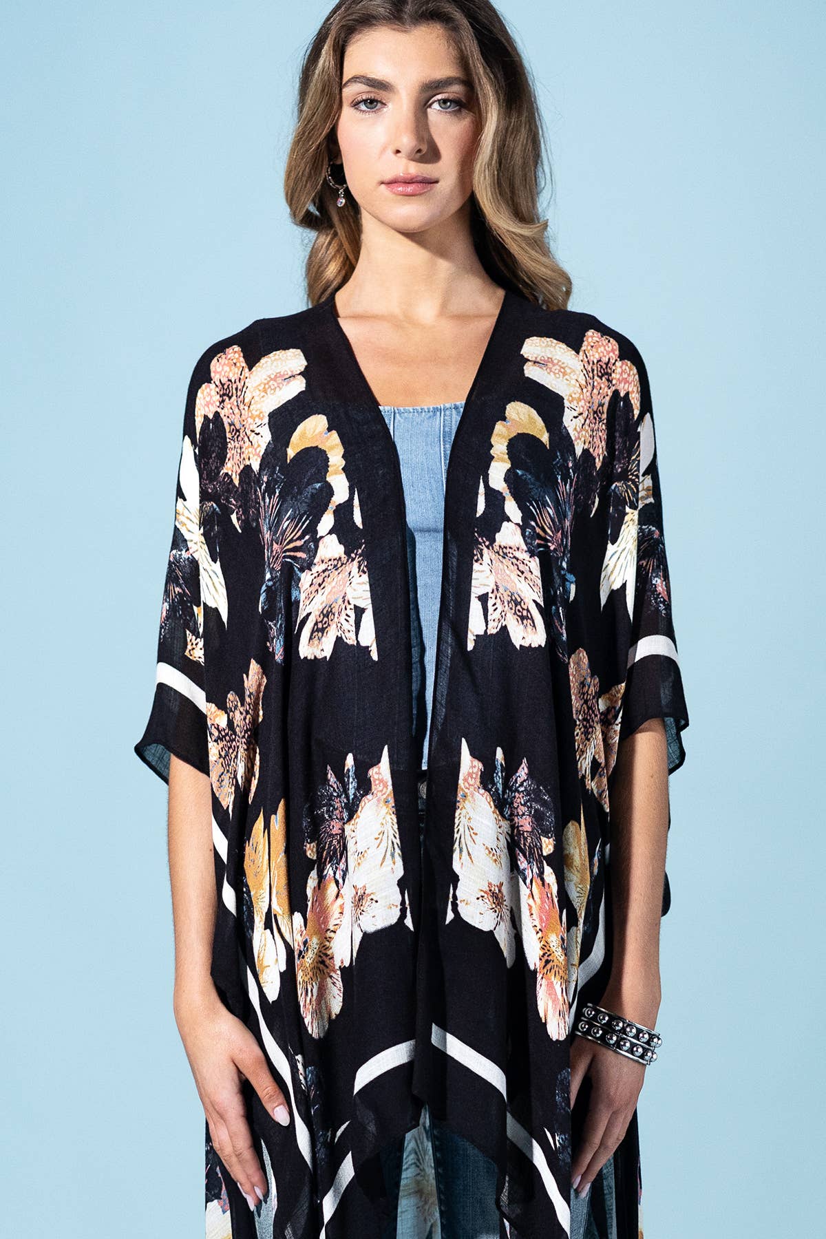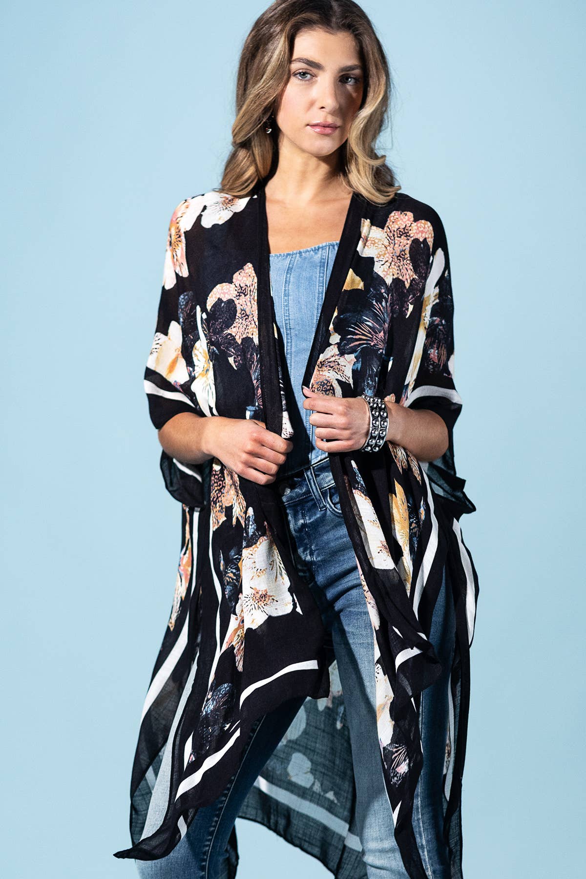 Lightweight kimono featuring an allover floral print set against a dark ground, creating contrast and depth. Finished with subtle stripe accents that frame the design without overpowering it. Designed with an open front, wide sleeves, and a relaxed, flowy drape for easy layering over everyday looks.