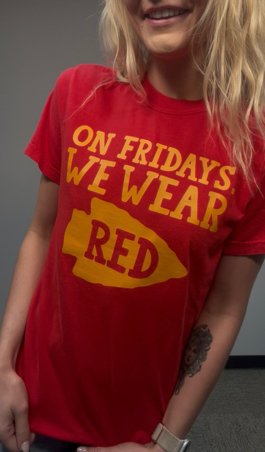 Show your Chiefs spirit with the "On Fridays We Wear RED" tee. This playful shirt adds a fun pop of color to end your week on a bold note. Perfect for casual outings or cozy days, it keeps your style vibrant and upbeat as you celebrate the start of the weekend.